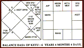 The Moon is in its sign of debilitation. The fifth lord, Jupiter, along with Saturn, are under the close aspect of Ketu from the sixth house. The badly placed Sun and Mars are under the close aspect of Rahu from the twelfth house. Although Mercury is apparently well placed and unafflicted, the sub-period of Mercury was of little help due to the affliction of its dispositor. As soon as the sub-period of Mars in the dasa of Saturn started there were problems to the father in his business and from the Government. The circumstances at home created tension for the native. The onset of the sub-period of Rahu in the dasa of Saturn and the affliction of the Sun by Rahu triggered acute tension for the native that involved his father as well, as the Sun is a natural significator of father. In August 1994, the astral remedies were sought when the natal afflictions and the long duration were explained to the father. Though the astral remedies were started, to cut short the duration more stress was placed by the father of the native on the psychiatric treatment in lieu of the astral remedies. The prolonged psychiatric treatment proved to be of no help and the native's father returned to astral remedies. The performance of astral remedies helped in steering the native clear of the problem. The child is now leading a normal life and participating in the family business. The problem, however, took its toll on the child's studies.